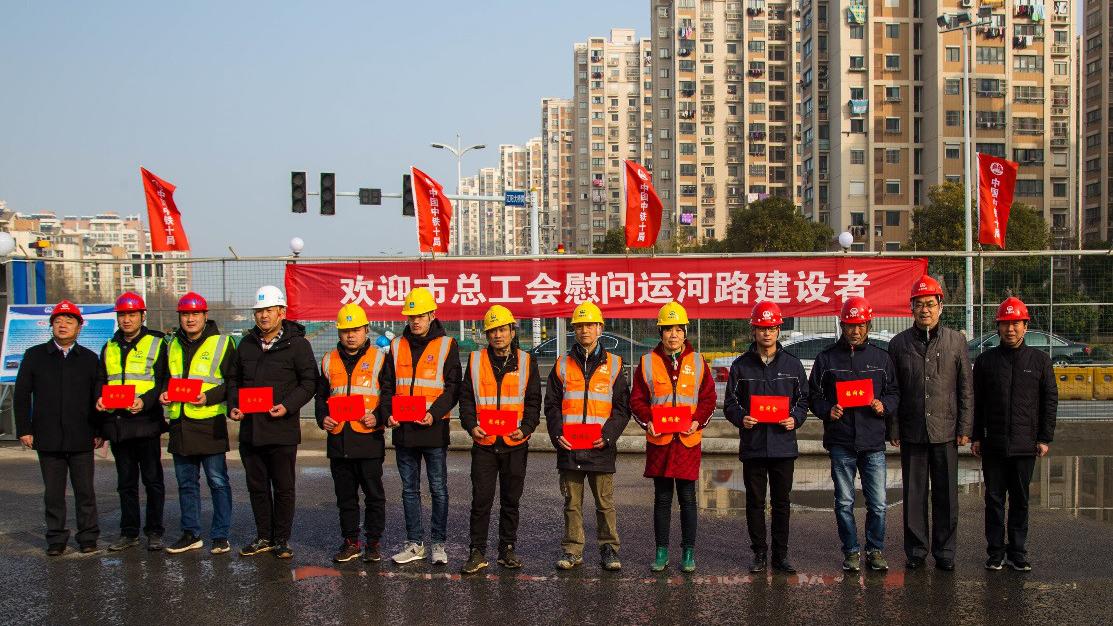 在新春佳節(jié)即將到來之際,1月19日上午,市總工會副主席戚安寶帶隊來到運(yùn)河路快速化改造工程項目部,親切慰問了一線施工人員,并為他們送上了新春的祝福。城控集團(tuán)副總經(jīng)理季紅軍、工會主席張正斌參加了慰問。
