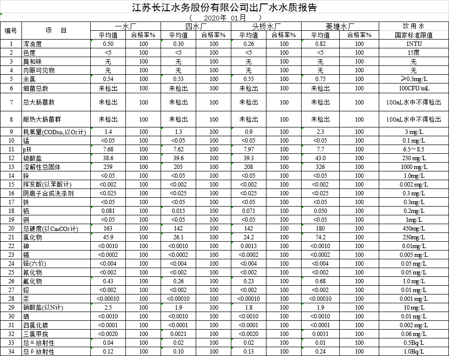 自來水水質(zhì)報(bào)告(2020年1月份)