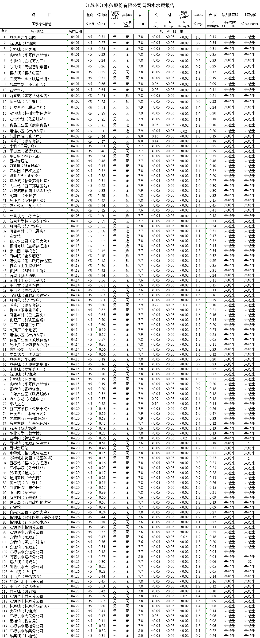 江蘇長江水務股份有限公司管網(wǎng)水水質報告(2020年4月)