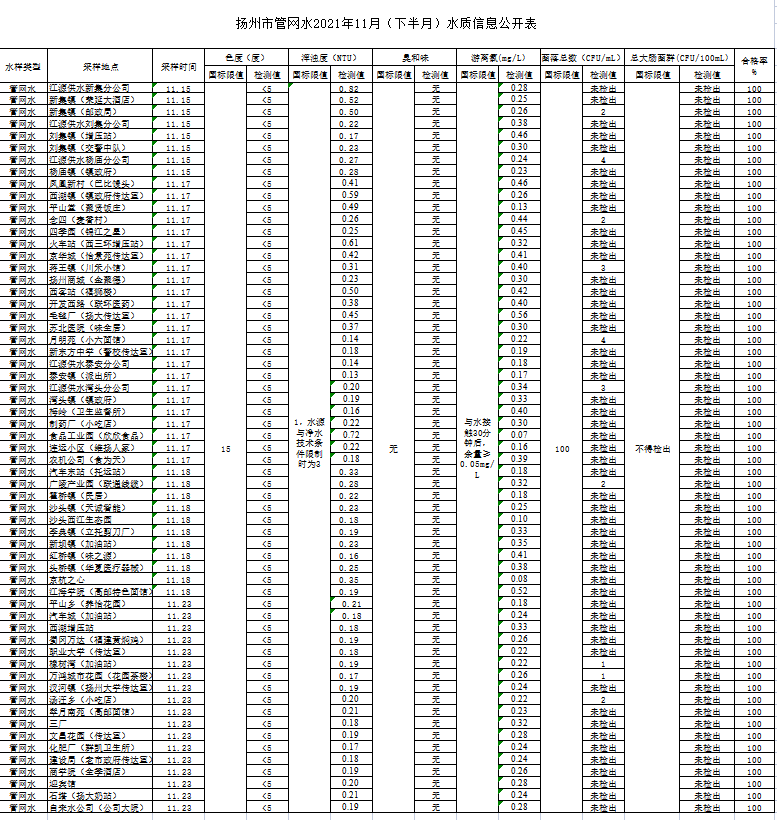揚(yáng)州市管網(wǎng)水2021年11月(下半月)水質(zhì)信息公開表