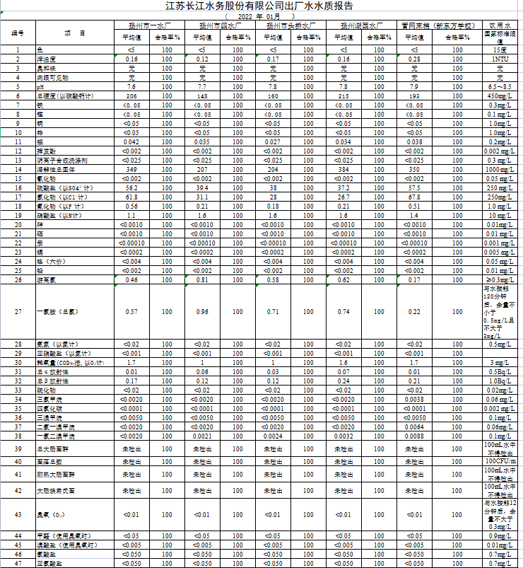 江蘇長江水務(wù)股份有限公司出廠水水質(zhì)報告(2022年3月)