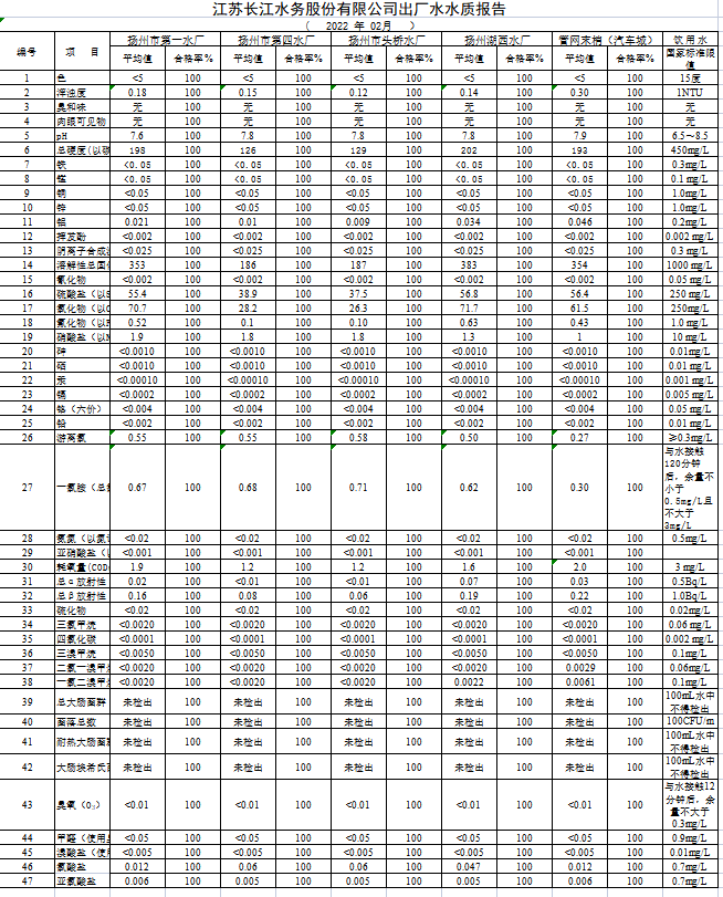 江蘇長江水務股份有限公司出廠水水質(zhì)報告 ( 2022 年 02月 )