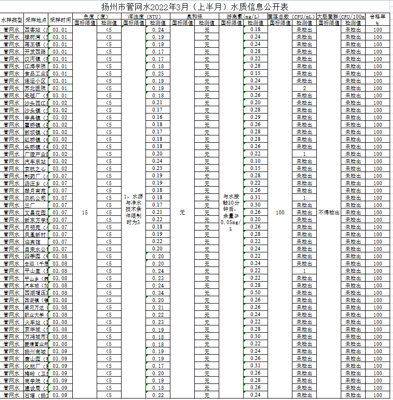 揚(yáng)州市管網(wǎng)水2022年3月(上半月)水質(zhì)信息公開(kāi)表