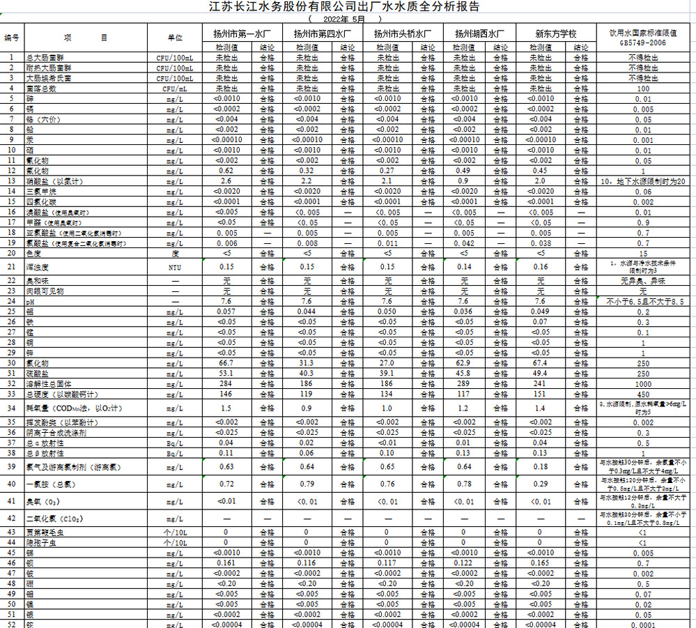 江蘇長(zhǎng)江水務(wù)股份有限公司出廠水水質(zhì)全分析報(bào)告 ( 2022年 5月 )