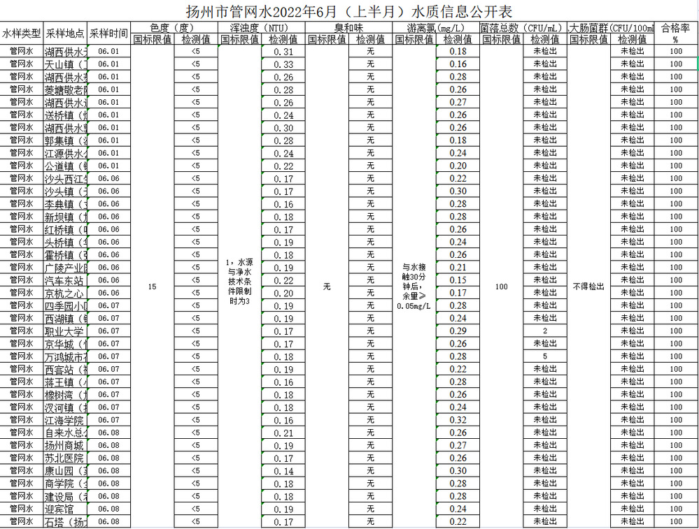 揚(yáng)州市管網(wǎng)水2022年6月(上半月)水質(zhì)信息公開表