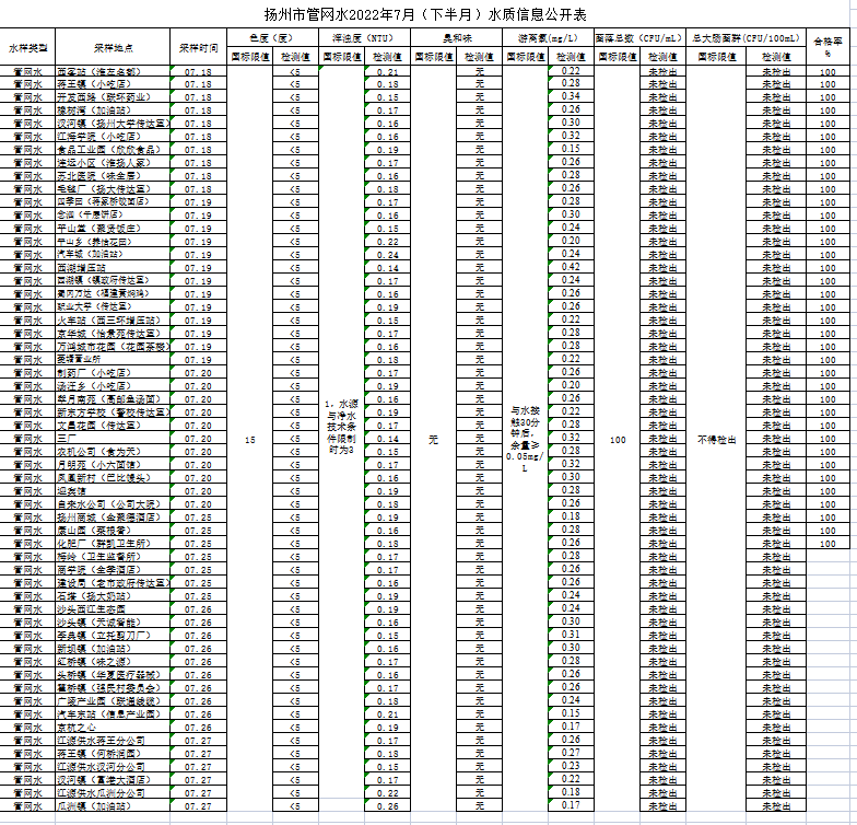 揚州市管網(wǎng)水2022年7月(下半月)水質(zhì)信息公開表