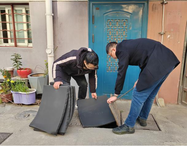 在社區(qū)負(fù)責(zé)人的協(xié)助下,黨員們迅速分組,攜帶專業(yè)工具和保溫棉材料,分赴各個(gè)樓棟給水表箱“穿衣蓋被”。黨員們以身作則,不畏嚴(yán)寒,手持保溫棉細(xì)心鋪設(shè)在每一個(gè)井蓋里,確保每一處細(xì)節(jié)都不遺漏。