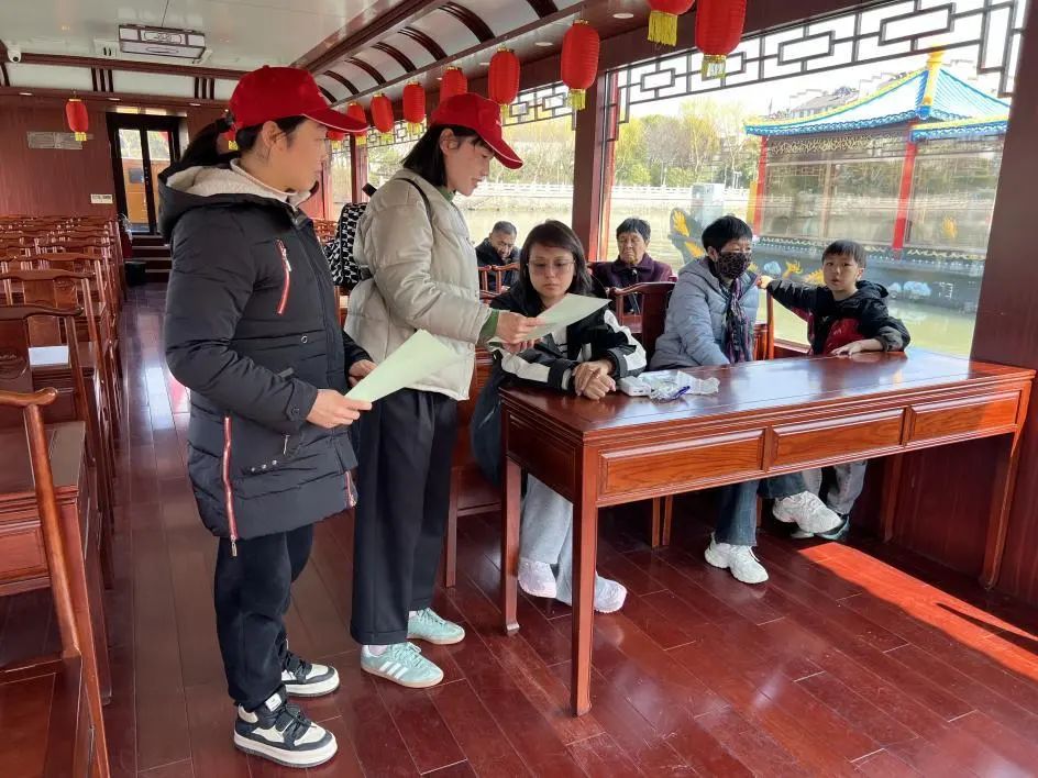 3月19日下午,志愿者們早早來到碼頭,登上游船向游客發(fā)放宣傳資料,詳細(xì)介紹“世界水日”的由來、意義和節(jié)約用水的重要性,呼吁大家關(guān)注水資源保護(hù)。同時,志愿者們深入講解了古運(yùn)河的歷史文化,讓游客們在欣賞美景的同時,感受到古運(yùn)河的獨特魅力。志愿者們還手持垃圾鉗、垃圾袋,沿著河岸,仔細(xì)清理河面上的漂浮物和岸邊的垃圾,他們的行動不僅美化了河道環(huán)境,也為周邊居民樹立了榜樣。